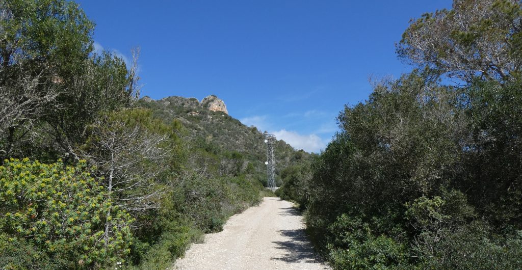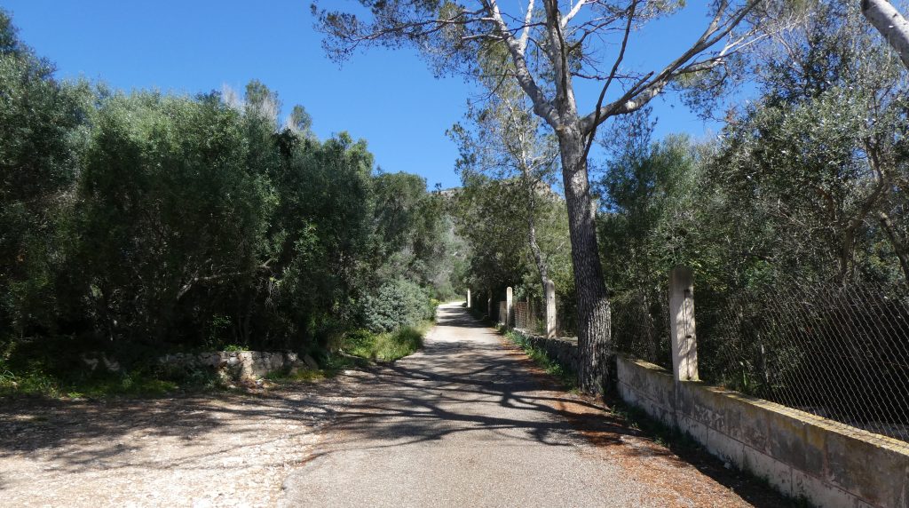 Den Weg, der sich nach Norden wendet, gehen wir entlang des Berghangs weiter. Während wir nach etwa 240 Meter auf unserer linken Seite einen Funkmast passiert haben, ändert sich nach weiteren etwa 170 Meter die beidseitig des Wegs gelegene Vegetation: Aus den Flächen der Garrigues treten wir in einen dünn besiedelten Wald aus Aleppo-Kiefern ein, dessen Boden mit Gräsern bedeckt ist. Der Weg durch den Wald führt uns nach etwa 210 Meter zu einem Anwesen, an dessen östlicher Seite der Weg weiter nach Son Servera verläuft.
