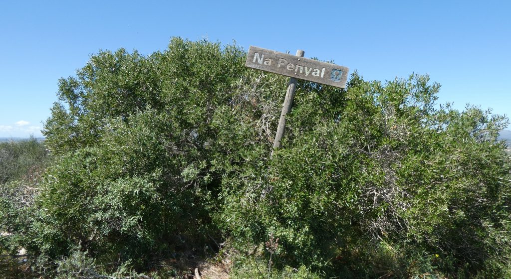 Nach dem Erklimmen des Übergangs wenden wir uns zunächst etwa 15 Meter nach Nordwesten; auf unserer rechten Seite befindet sich eine Mauer! An der Mauer wechseln wir in südwestliche Richtung und gelangen nach etwa 9 Meter wieder auf einen Trail, dem wir nach Südosten folgen. Über etwa 330 Meter schlängelt sich der Saum durch die Garrigue des Bergrückens, bevor er auf dem höchsten Punkt des Bergs an seiner nach Süden gelegenen Klippe endet.