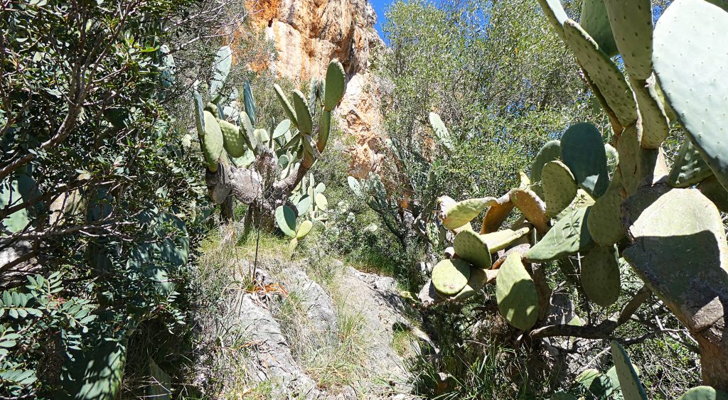 Wir nehmen den in östlicher Richtung verlaufenden Steig, der sich zunächst entlang der Berglehne bewegt, sodann aber wieder den Berghang hinaufklettert. Die sich vor uns auftürmende Felswand dient einem Greifvogelpaar zur Aufzucht ihrer Jungen, die an der Klippe für Mensch und Tier nahezu unerreichbar sind. Über einzelne Felsformationen und durch enge Ansammlungen von Opuntien, die sich in der vorhandenen Garrigue behauptet haben, endet der Pfad nach etwa 80 Meter an der Kaverne.