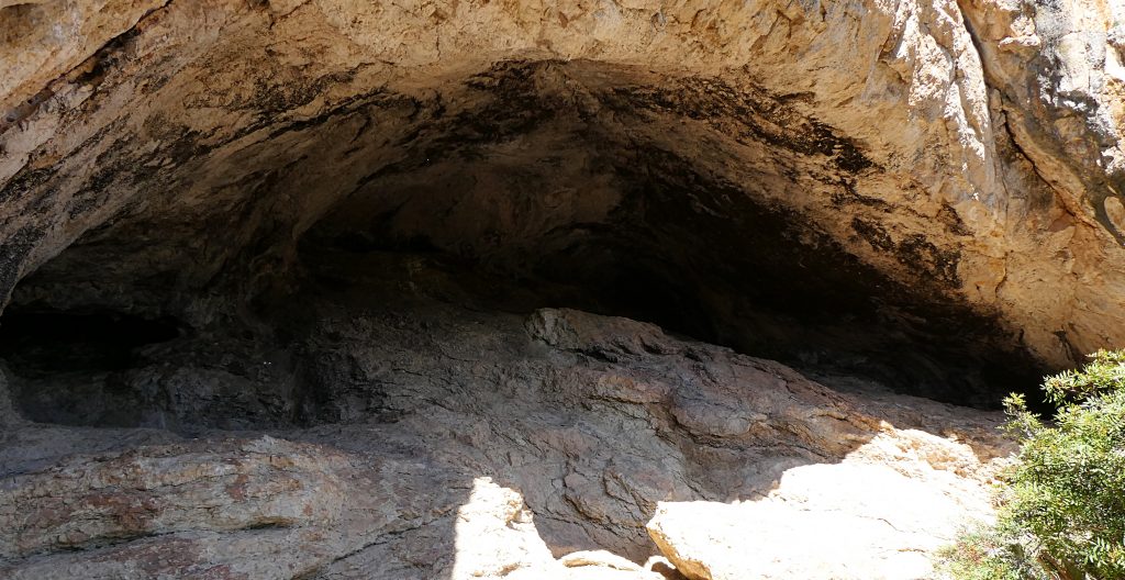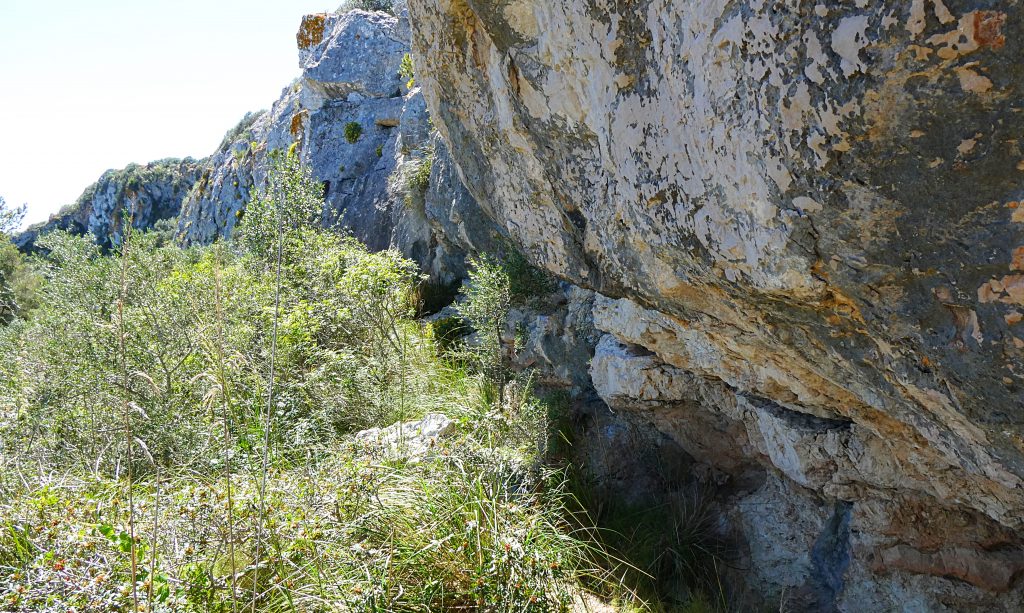 Nunmehr gelangen wir an eine Weggabelung, die zum einen nach Westen und zum anderen nach Osten verläuft. Während der westliche Saum weiterhin den Abstieg erlaubt, führt uns der östliche Trail zur cova (Höhle) de na Penyal, die sich weithin sichtbar in der südlich ausgerichteten Steilwand des Bergs gebildet hat.