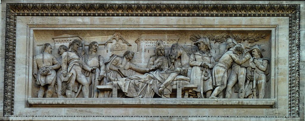 Oberhalb der Pfeiler des Triumphbogens befinden sich sechs Flachreliefs, die Szenen aus berühmten Schlachten wiedergeben.