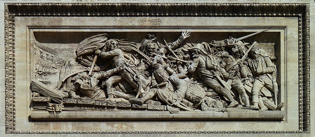Die Stützen des Triumphbogens sind auf der Westfassade und auf der östlichen Front mit vier Hochreliefs geschmückt, die die französische Geschichte seit der Französischen Revolution (1789 bis 1799) verherrlichen. Der linke Pfeiler der westlichen Fassade trägt das Bildwerk „Der Frieden 1815“, das von dem Bildhauer Antoine Étex (*1808 bis 1888) geschaffen wurde. Mit dem ebenfalls von Étex stammenden Relief „Der Widerstand 1814“ ist die rechte Säule der Westfront verziert. Auf dem linken Pfeiler der östlichen Fassade hebt sich das von dem Bildhauer Jean-Pierre Cortot (*1787 bis 1843) gestaltete Relief „Der Triumph Napoleons 1810“ ab. Die rechte Stütze der östlichen Front zeigt das von dem Bildhauer François Rude (*1784 bis 1855) geschaffene Bildwerk „Der Auszug der Freiwilligen 1792“. Es zeigt eine Gruppe ausziehender Revolutionäre, die das in der Nacht vom 25. auf den 26. April 1792 von dem Komponisten und Offizier Claude Joseph Rouget (*1760 bis 1836) komponierte Revolutionslied, die Marseillaise, auf den Lippen zu haben scheinen. Während das Werk von Cortot noch in der Tradition des Klassizismus (1770 bis 1840) steht, wendet sich das Relief von Rude bereits der Romantik (1795 bis 1835) zu, die die heroische Leidenschaftlichkeit der „singenden Revolutionäre“ ganz genau erkennen lässt.