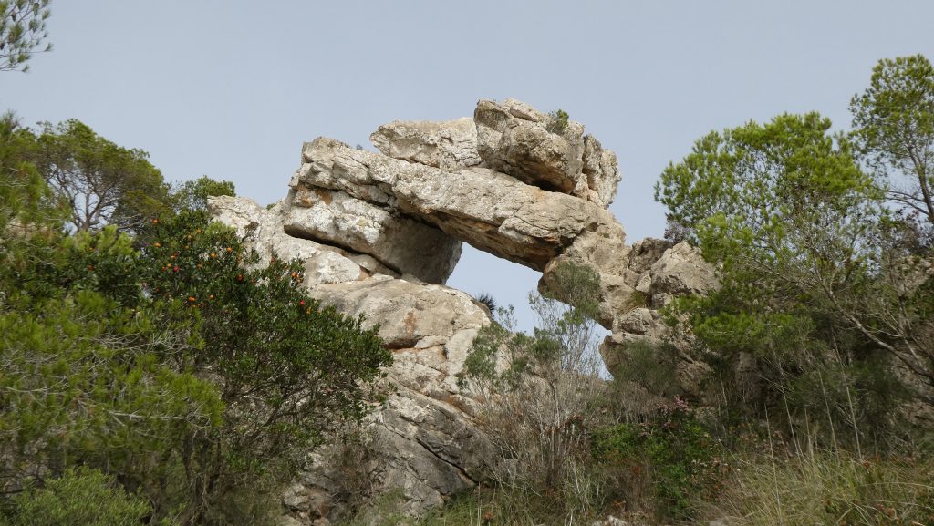 Er führt uns in nordwestlicher Richtung bis kurz unterhalb des Kamms des Bergmassivs. Unmittelbar vor uns erhebt sich plötzlich das unwirklich anmutende forat de s’Orelleta: Das Felsentor erscheint uns, als ob Bauklötze von einem Riesen aufgestapelt worden seien.