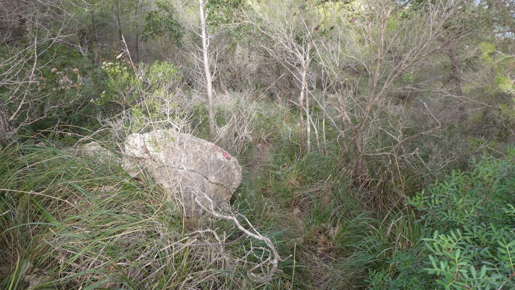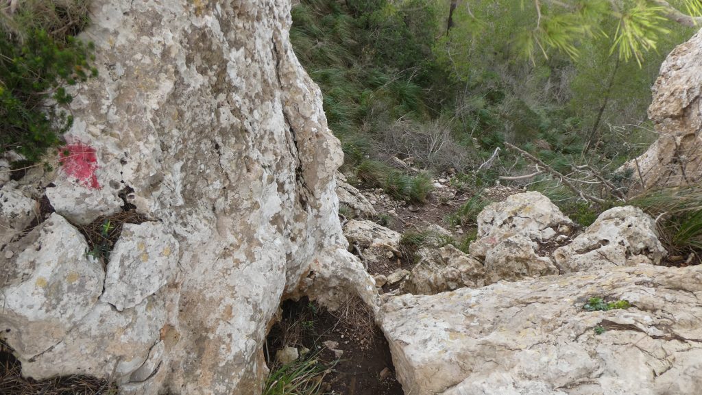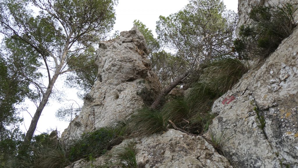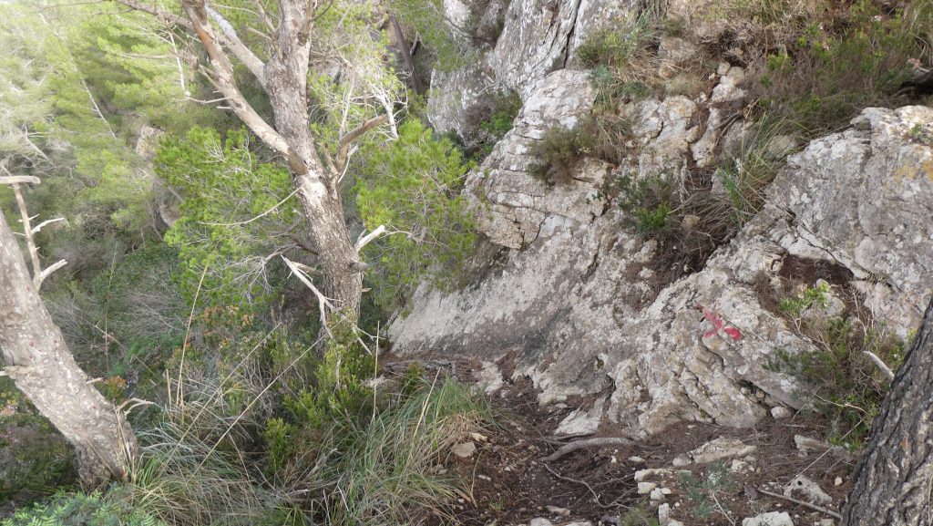 Obwohl uns die roten Punkte weiterhin nach Norden zu führen scheinen, wendet sich der Trail nunmehr in östliche Richtung. Nur wenige Meter östlich der Waldblöße finden sich wieder die roten Markierungen, die uns über den steil aufsteigenden Pfad, der auch eine etwa 3 Meter hohe Kletterpassage beinhaltet, in östlicher Richtung bis an die Gipfelklippe des puig des Moro heranführen.