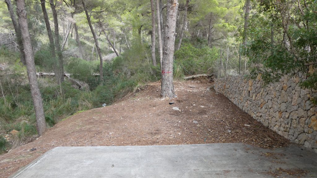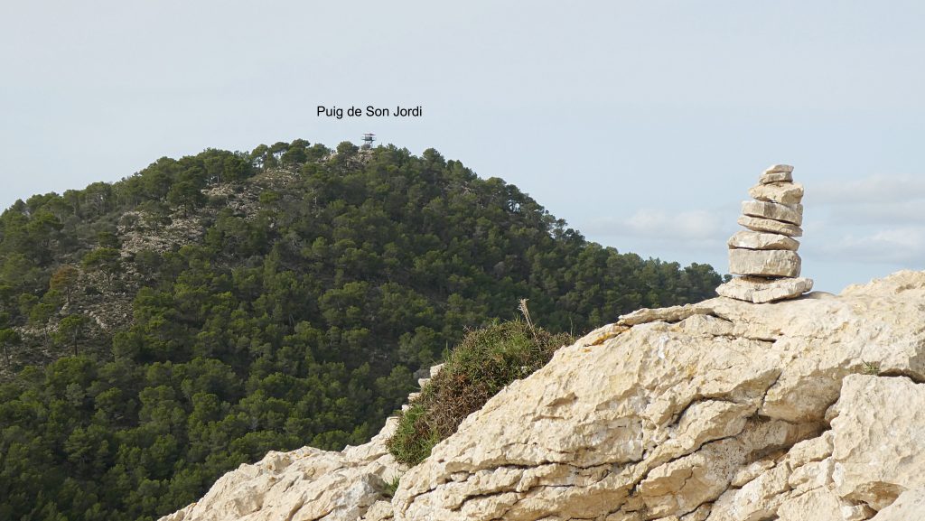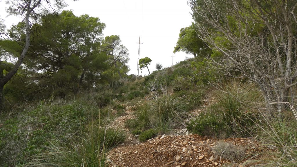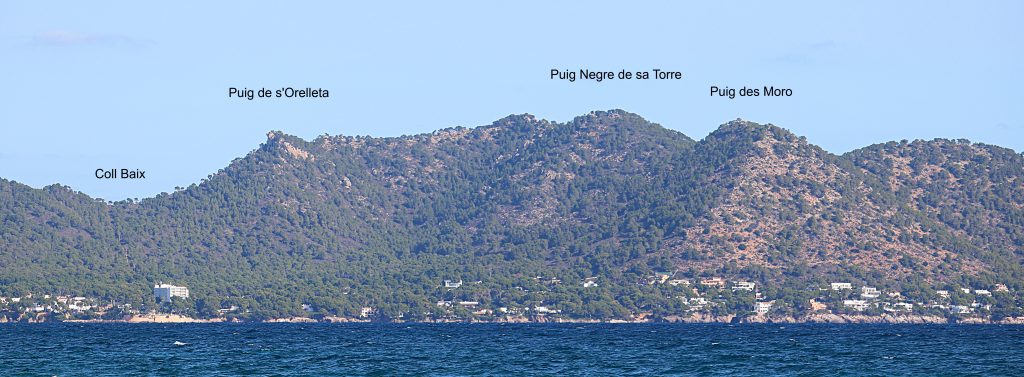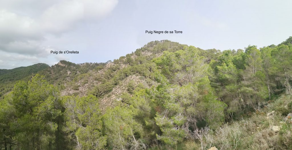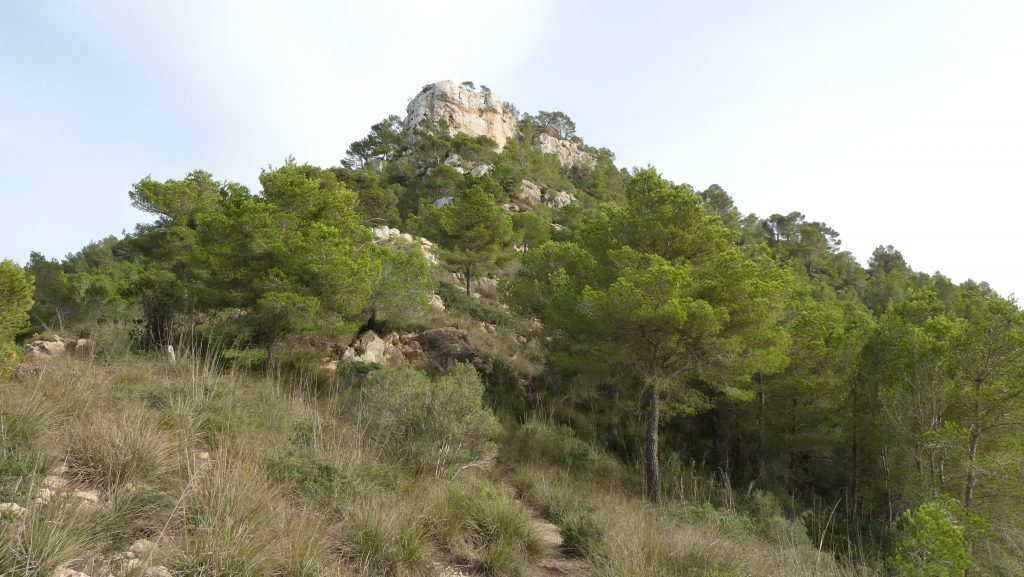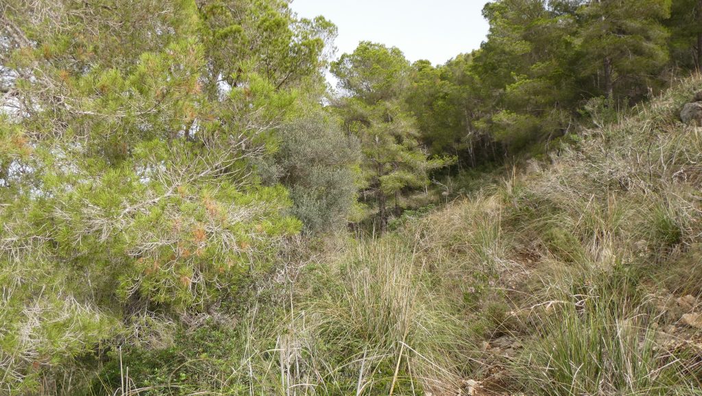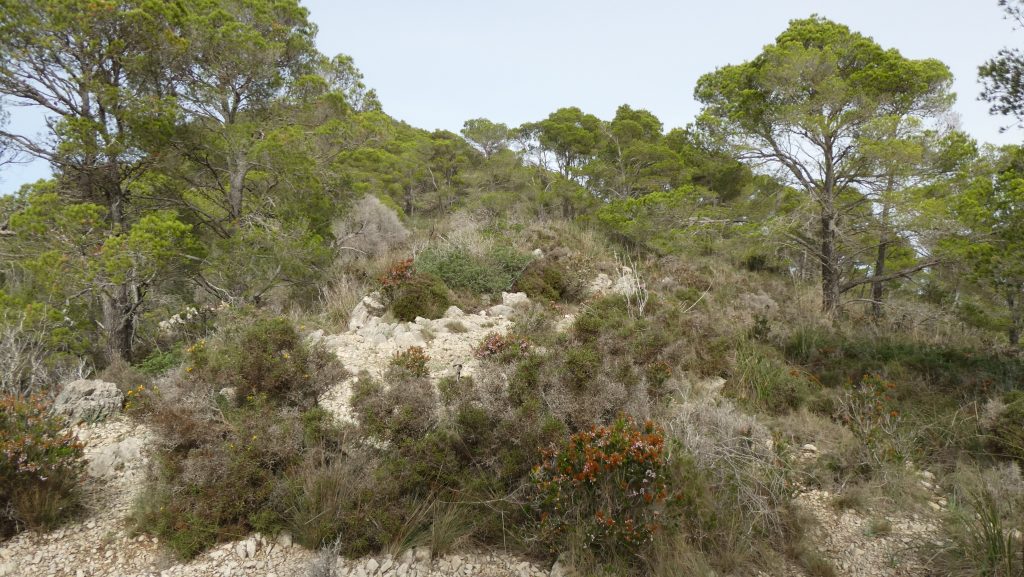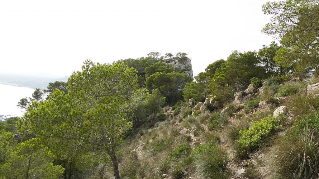 Nachdem wir nach etwa 55 Meter die Felswand erreicht haben, folgen wir dem Pfad in nördlicher Richtung. Über die Flanke des puig des Moro gelangen wir weiterhin durch den Wald aus Aleppo-Kiefern nach etwa 260 Meter auf den Rücken des puig Negre de sa Torre, der nur noch licht mit Aleppo-Kiefern bewachsen ist.
