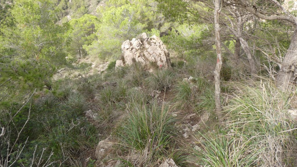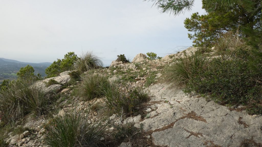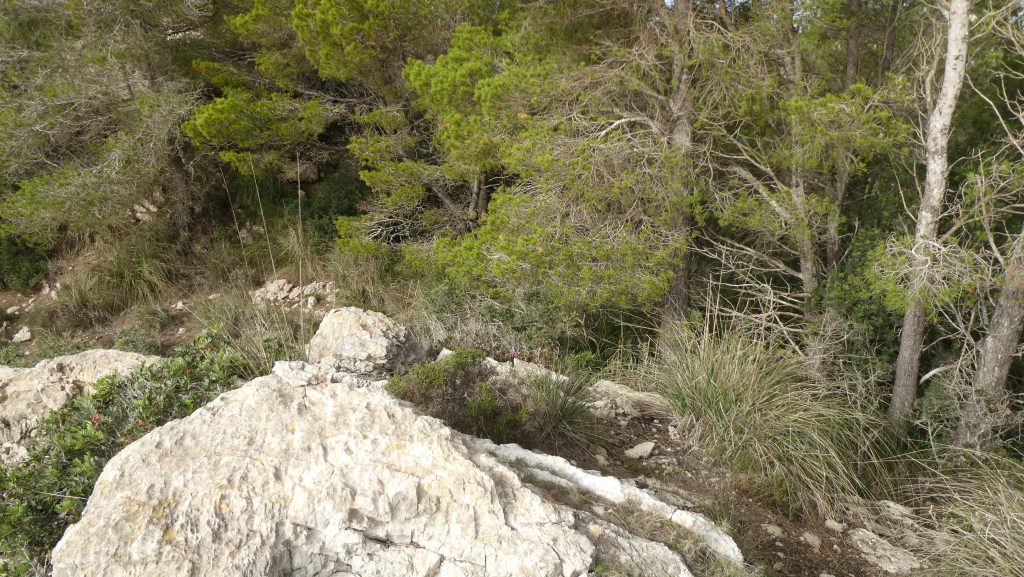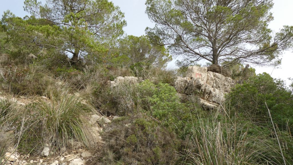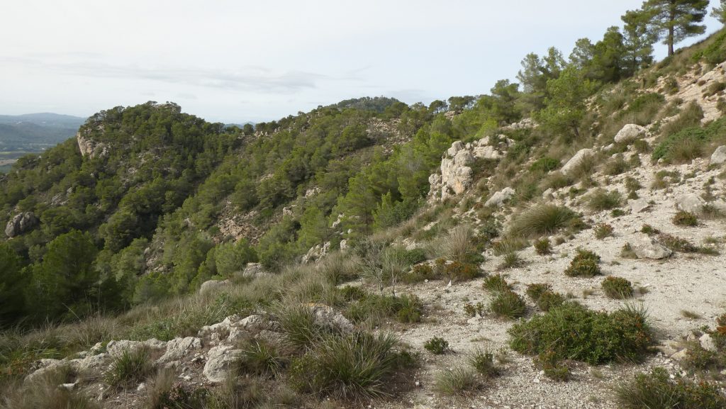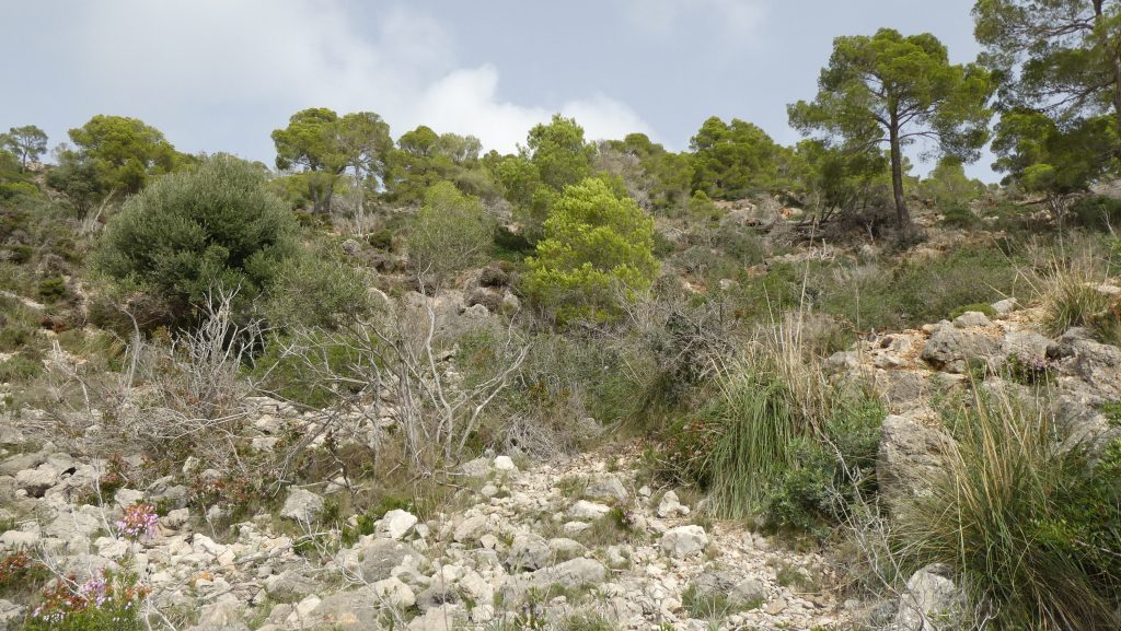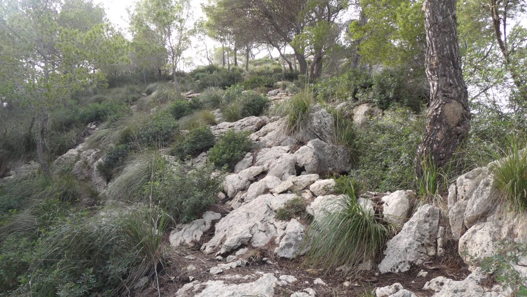 Nach etwa 140 Meter wenden wir uns nach Nordwesten, um dem über die Flanke des puig des Moro führenden Steig zu folgen. Unsere Wanderung führt uns weiter über die spärlich mit Gräsern und Sträuchern bewachsene Freifläche, aus der sich nur vereinzelte Bäume erheben, nämlich Aleppo-Kiefern und Olivenbäume. In einer kontinuierlichen Steigung führt uns der Trail nach etwa 330 Meter an einen Bergsturz, dessen Geröll wir jedoch ohne besondere Schwierigkeiten überwinden.