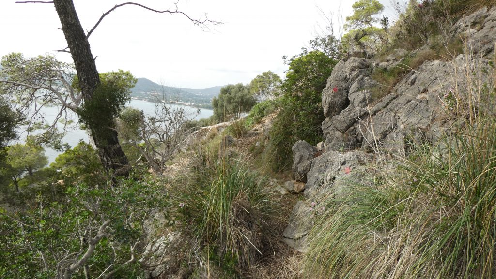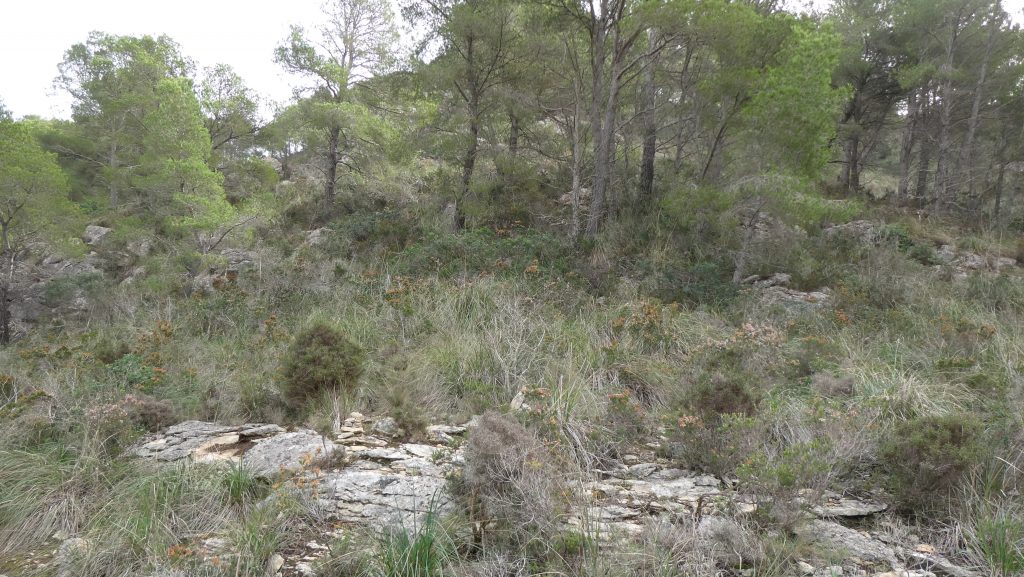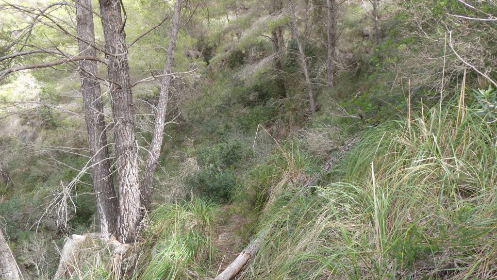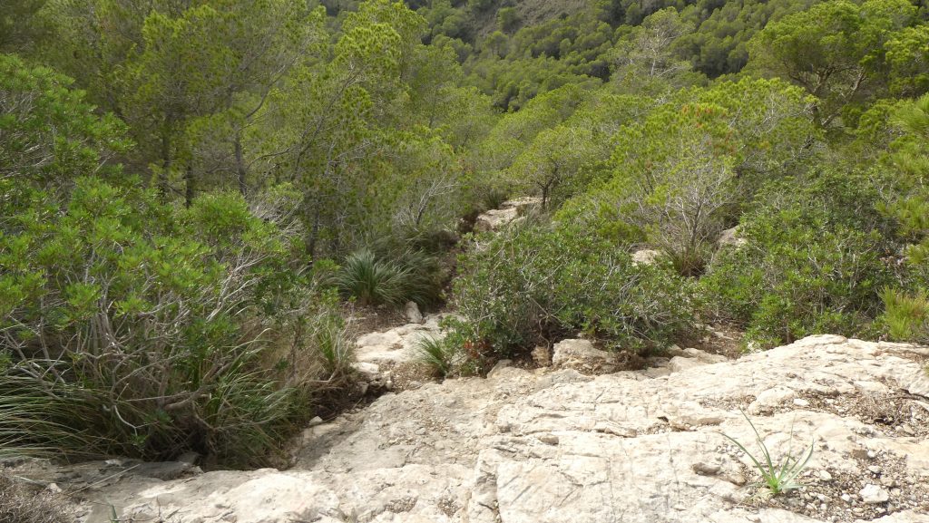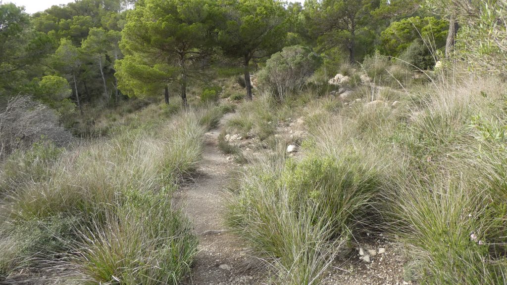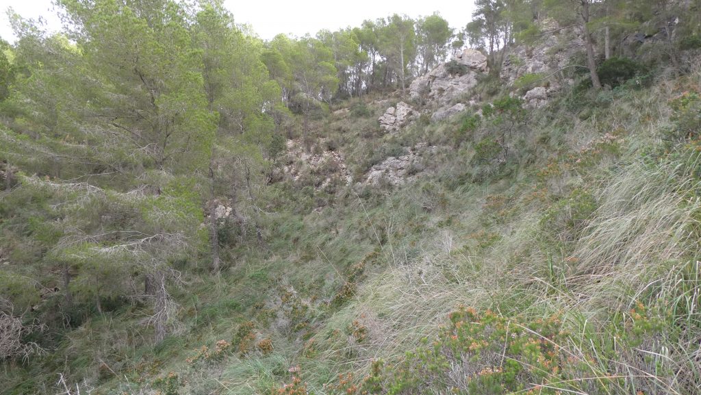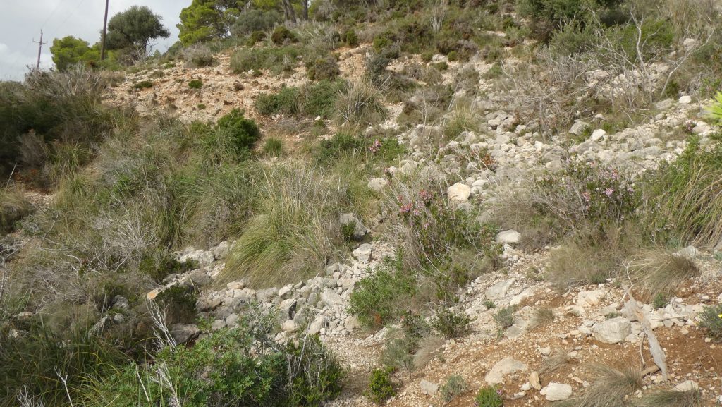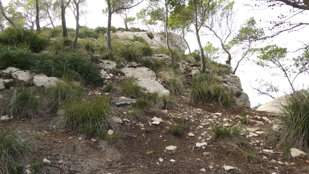 Nach etwa 140 Meter wenden wir uns nach Nordwesten, um dem über die Flanke des puig des Moro führenden Steig zu folgen. Unsere Wanderung führt uns weiter über die spärlich mit Gräsern und Sträuchern bewachsene Freifläche, aus der sich nur vereinzelte Bäume erheben, nämlich Aleppo-Kiefern und Olivenbäume. In einer kontinuierlichen Steigung führt uns der Trail nach etwa 330 Meter an einen Bergsturz, dessen Geröll wir jedoch ohne besondere Schwierigkeiten überwinden.