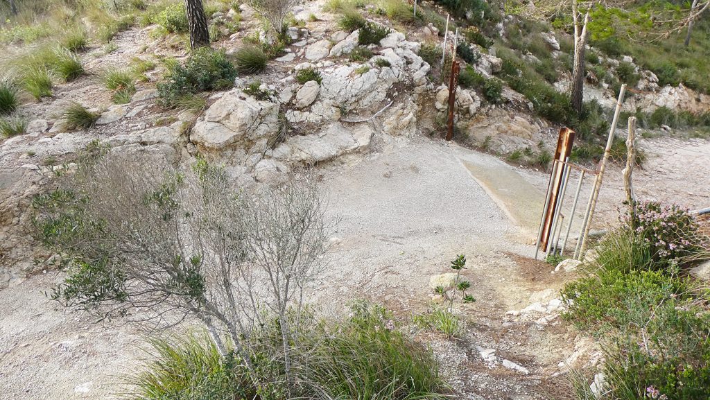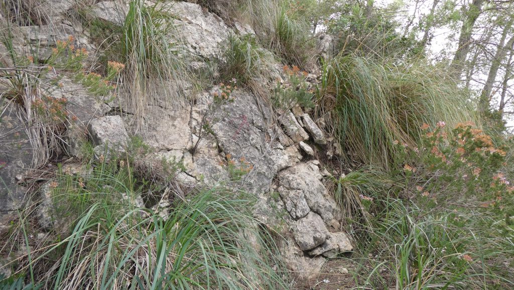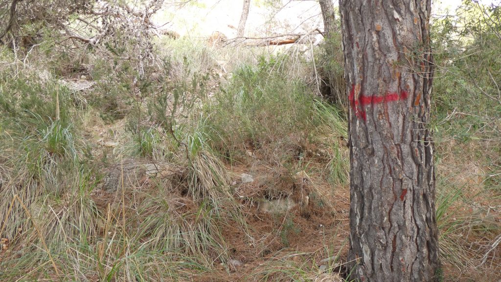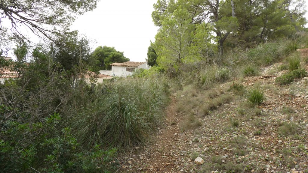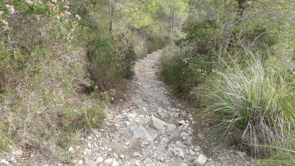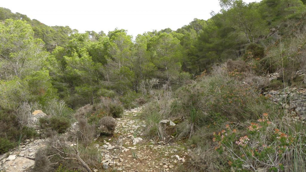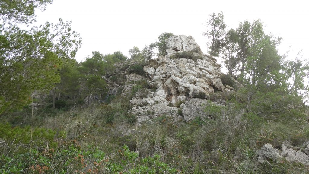 Nach etwa 140 Meter wenden wir uns nach Nordwesten, um dem über die Flanke des puig des Moro führenden Steig zu folgen. Unsere Wanderung führt uns weiter über die spärlich mit Gräsern und Sträuchern bewachsene Freifläche, aus der sich nur vereinzelte Bäume erheben, nämlich Aleppo-Kiefern und Olivenbäume. In einer kontinuierlichen Steigung führt uns der Trail nach etwa 330 Meter an einen Bergsturz, dessen Geröll wir jedoch ohne besondere Schwierigkeiten überwinden.