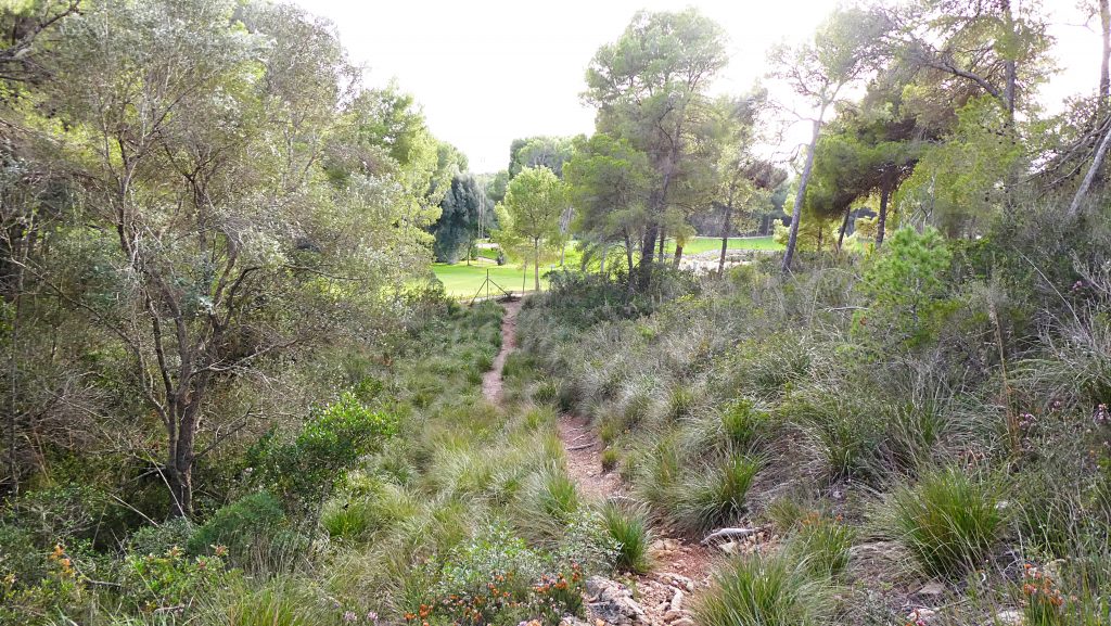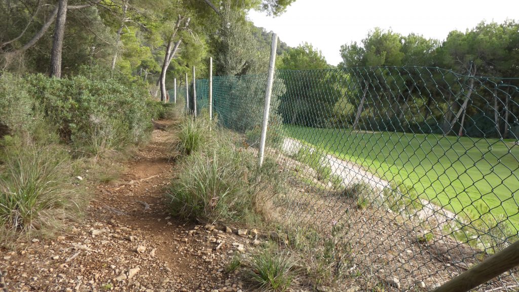 In südlicher Richtung bringt uns der Pfad durch einen Wald aus Aleppo-Kiefern nach etwa 560 Meter an den Golfplatz des Club de Golf (Golfclub) de Son Servera.