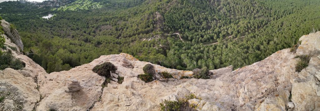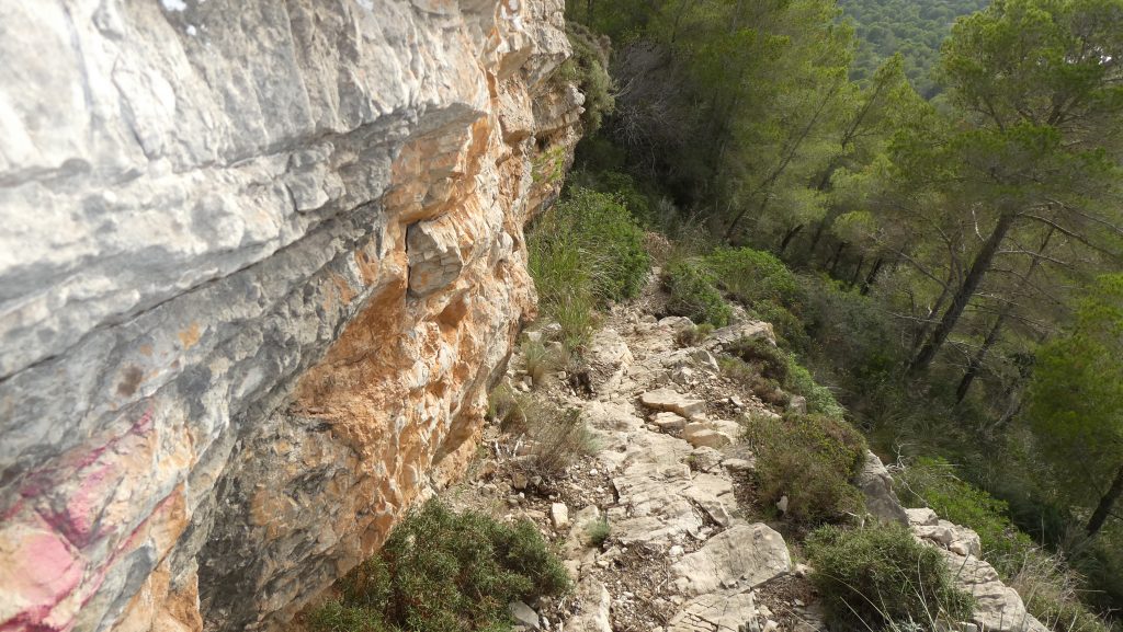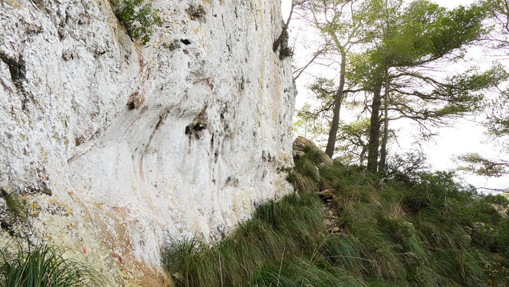 Über eine etwa 10 Meter tiefe Kletterpassage gelangen wir auf einen etwa 2 Meter breiten Vorsprung, der uns in westliche Richtung führt. Während wir auf unserer einen Seite die senkrecht aufsteigende Felswand der mirador des Puig de s’Orelleta haben, begleitet uns auf unserer anderen Seite der etwa 40 Meter tiefe Abgrund, in dem wir von oben auf die Wipfel eines Walds aus Aleppo-Kiefern schauen.