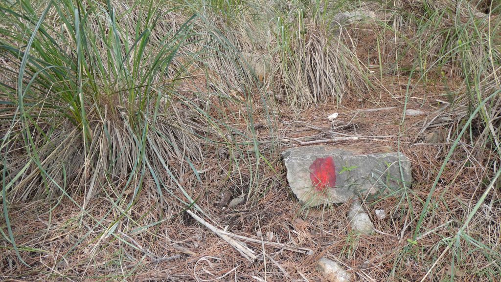 Die roten Markierungen werden uns während unseres gesamten Wegs ein treuer Begleiter sein. Sie präsentieren sich in Abständen von etwa 5 bis 7 Meter zumeist in der Form von Punkten, zuweilen aber auch in der Form von Pfeilen, auf Steinen, Felsen oder Bäumen. Zwar sind die roten Zeichen durch die Einflüsse von Sonne und Wasser vereinzelt verwittert, doch lässt ihre enge Abfolge den Weg stets erkennen.