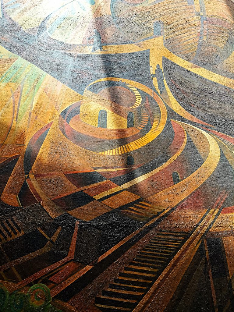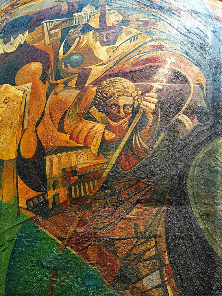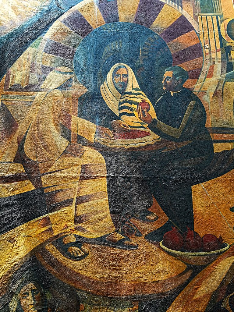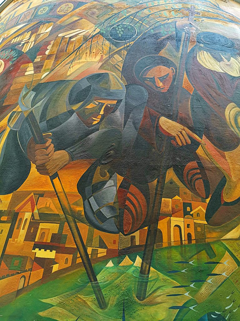 Entlang des Aufstiegs erläutern fünfunddreißig Tafeln die wichtigsten Darstellungen des Gemäldes in Katalanisch und Kastilisch. Ihre nachstehende Übertragung ins Deutsche orientiert sich weniger an der syntaktischen Gefälligkeit als an der nachvollziehbaren Übersetzung.