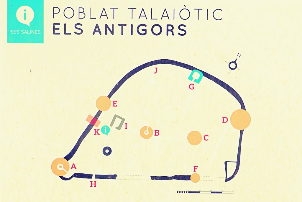 Das Gelände des poblat talaiòtic dets Antigors (Talayotisches Dorf der Altertümer) (39.330036 N, 3.055844 O) dehnt sich in ses Salines nordöstlich der carrer del Torrent aus.