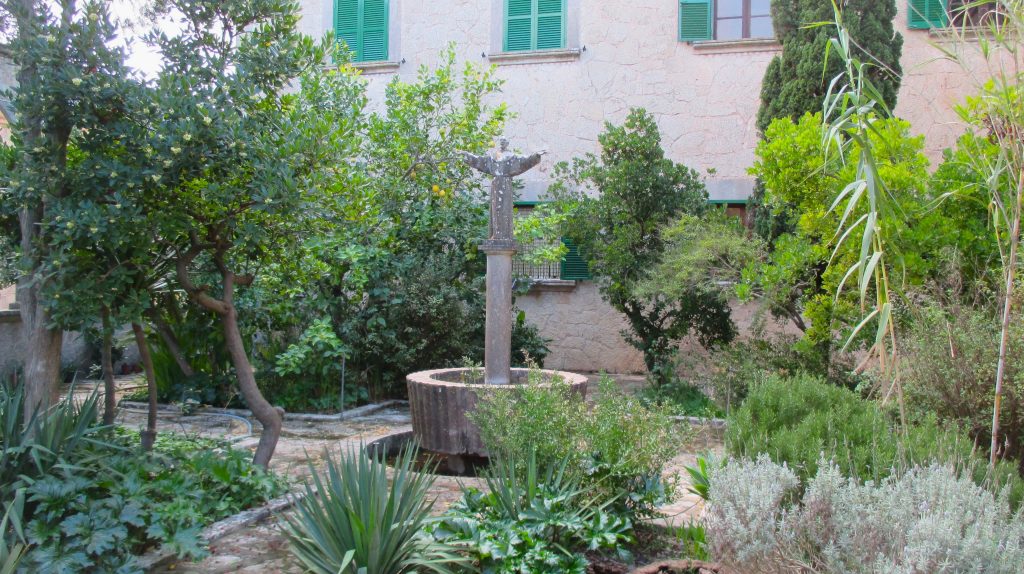 Der westliche Garten wird durch den font de Sant Francesc geprägt, der im Zentrum eines griechischen Kreuzes steht, das auf dem Boden durch die Wege gebildet wird. Das Rundbecken, aus dem sich ein tiegelförmiges Gefäß aus Stein erhebt, ist in den Boden eingelassen. In der Mitte des Tiegels strebt eine runde Steinsäule in die Höhe, auf der eine steinerne Figur des Heiligen Francesco d‘ Assisi (*1181/82 bis 1226) steht. Bekleidet mit einer bis zum Boden reichenden Kutte breitet Francesco seine Arme in Schulterhöhe weit aus, um seine Betrachter mit nach oben geöffneten Handflächen zu segnen; die Körperhaltung bildet die Silhouette eines lateinischen Kreuzes nach!